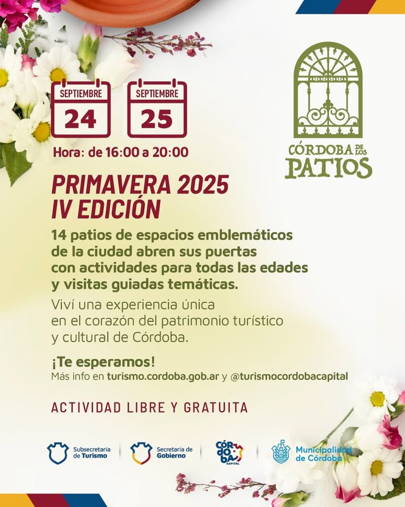 La primavera llega con arte, música y patrimonio en Córdoba Capital. El 24 y 25 de septiembre, vecinos y turistas podrán recorrer 14 patios históricos y culturales que abrirán sus puertas de manera gratuita, en la IV edición de “Córdoba de los Patios”.