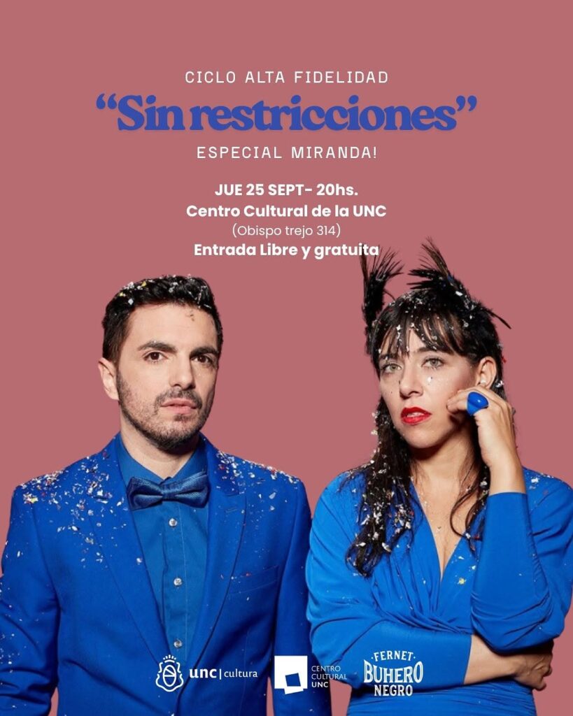 El ciclo Alta Fidelidad, organizado por @culturaunc, vuelve con una nueva edición dedicada a celebrar discos fundamentales de la cultura pop. En esta oportunidad, el encuentro estará centrado en Sin Restricciones, el icónico álbum de Miranda!, un trabajo que marcó a toda una generación con su estilo brillante, kitsch y emocional.