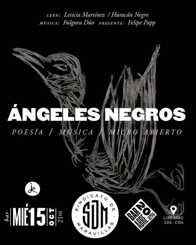El miércoles 15 de octubre, el Sindicato de Maravillas abre sus puertas a “Ángeles Negros”, un ritual poético y musical donde los límites entre realidad y fantasía se desdibujan. Una invitación a sumergirse en la palabra, la música y el misterio, con micrófono abierto y la consigna de vestirse de negro.