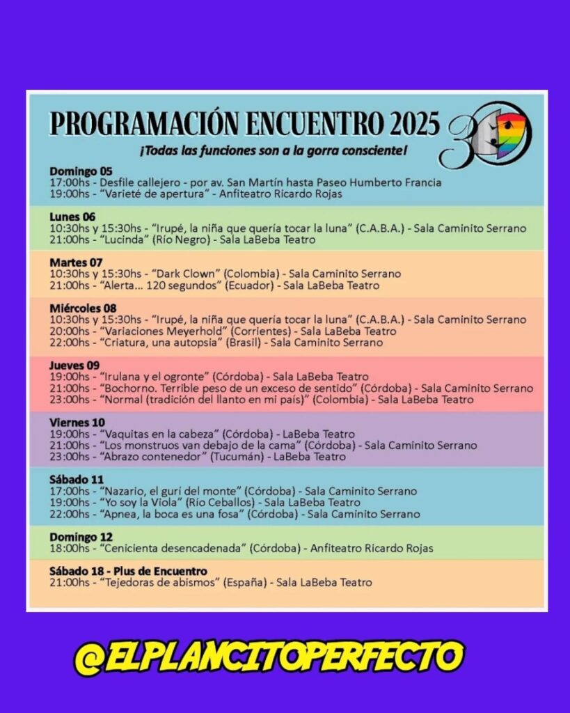 Este evento, que se consolida como uno de los más importantes de las Sierras Chicas, celebra tres décadas de historia compartida, de arte, abrazos, luchas y resistencia autogestiva. Durante una semana, se podrá disfrutar de una grilla de funciones con grupos locales, nacionales e internacionales.