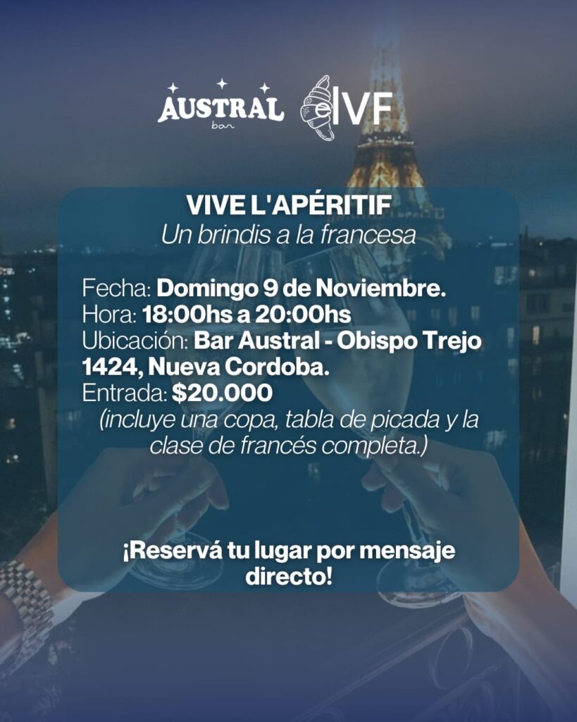 Este domingo 9 de noviembre, Bar Austral propone un viaje sensorial directo a Francia sin salir de Nueva Córdoba: degustación, brindis y una clase práctica para aprender a pedir y desenvolverse en un verdadero “apéro” francés. Cupos limitados.