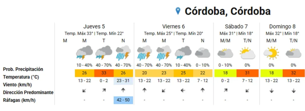 - El Servicio Meteorológico Nacional prevé un jueves con tormentas intensas, ráfagas de hasta 50 km/h y un viernes con máxima de apenas 25°C. Hay Alerta Amarila vigente en la zona. El fin de semana volverá el calor.