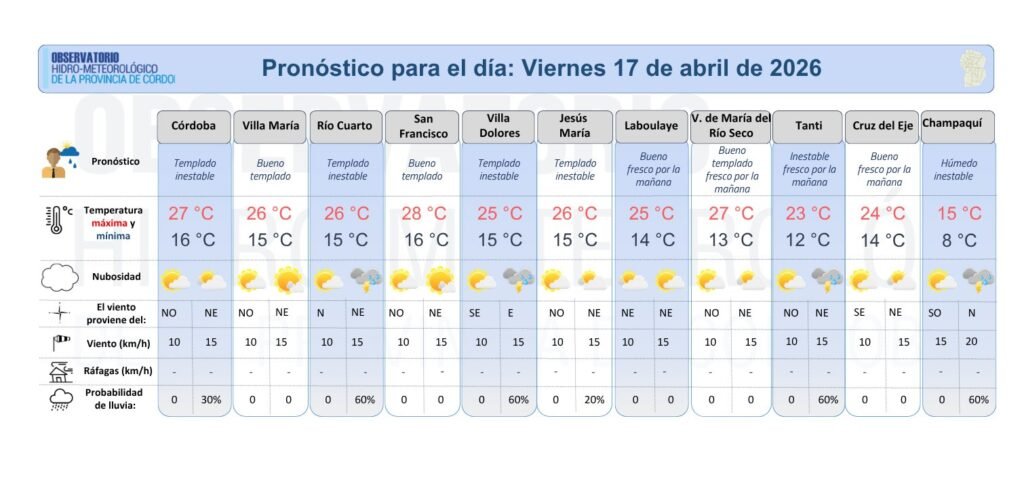 El panorama cambia drásticamente para el domingo, cuando un frente de mal tiempo ingresará a la región. Los pronósticos indican una probabilidad de lluvia del 95%, prácticamente asegurando precipitaciones durante gran parte del día. La temperatura máxima descenderá a 21°C, marcando un contraste significativo con el sábado soleado y el clima Córdoba fin de semana presentará dos jornadas muy distintas.