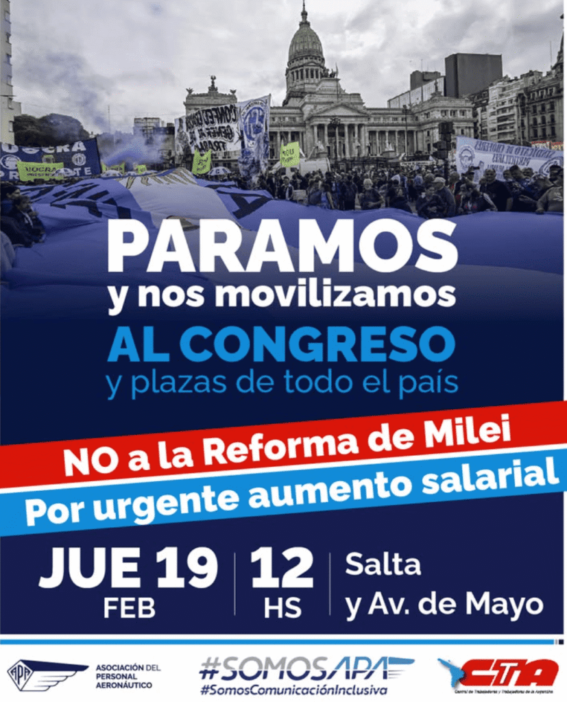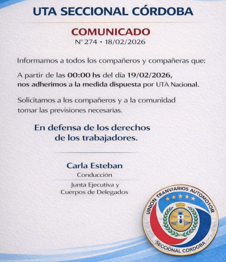 - La huelga de 24 horas convocada para este jueves 19 de febrero afectará el transporte urbano e interurbano, los vuelos, la banca, las escuelas y los servicios estatales. Además, la protesta Córdoba Paro Nacional se realiza en vísperas del debate en Diputados del proyecto de reforma laboral impulsado por el Gobierno nacional.