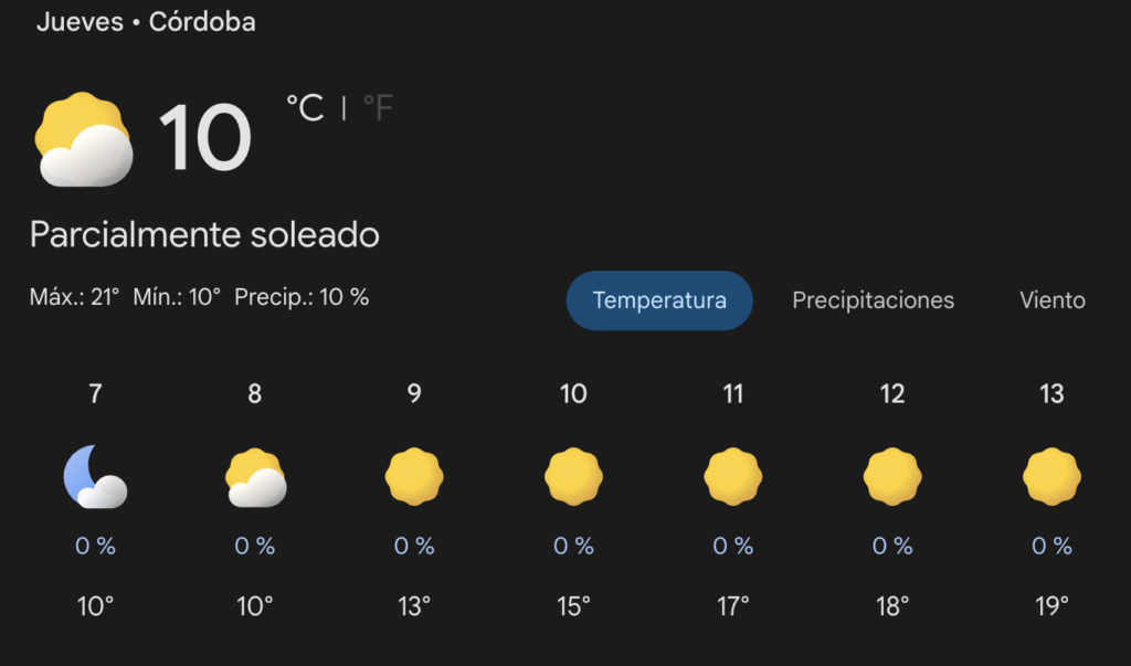 Hacia la noche, se prevé un leve descenso de la temperatura, rondando los 15°C, con nubosidad variable. Se recomienda a los cordobeses contar con una prenda de abrigo ligera para el cierre del día. La amplitud térmica característica de la región se hará sentir al ocultarse el sol, previsto para las 18:47.
