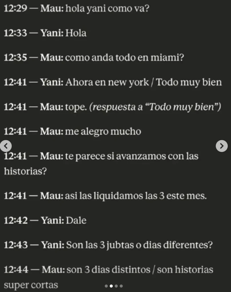 Pero los chats revelan además una propuesta comercial concreta. Según los mensajes difundidos, Novelli le plantea a Latorre publicar «historias» en Instagram a cambio de un pago. «¿Te parece si avanzamos con las historias? Así las liquidamos las tres este mes», le escribe el empresario, a lo que la panelista responde afirmativamente y pide precisiones sobre el formato. «Son tres días distintos, son historias súper cortas», aclara Novelli en la conversación. Esta propuesta se suma al hecho de que Yanina Latorre aparece en la causa $LIBRA como parte de la investigación.