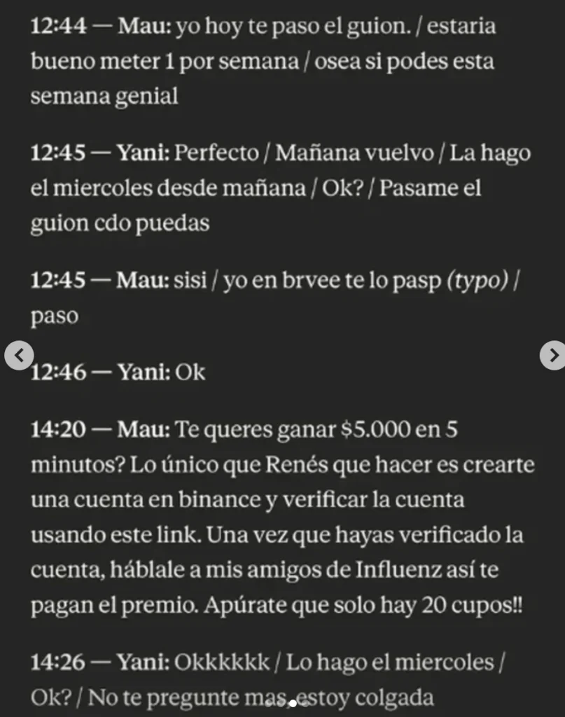 En otro fragmento del intercambio, el empresario le hace a Latorre una propuesta aún más directa: «¿Te querés ganar 5.000 dólares en 5 minutos? Lo único que tenés que hacer es crearte una cuenta en Binance y verificar la cuenta usando este link. Una vez que hayas verificado la cuenta, hablale a mis amigos de Influenz así te pagan el premio«. La oferta expone el mecanismo habitual de promoción de activos digitales a través de figuras públicas, en el que los influencers son remunerados por generar registros y atraer nuevos usuarios a plataformas de criptomonedas. Por lo tanto, Yanina Latorre aparece en la causa $LIBRA justamente por este tipo de operaciones.