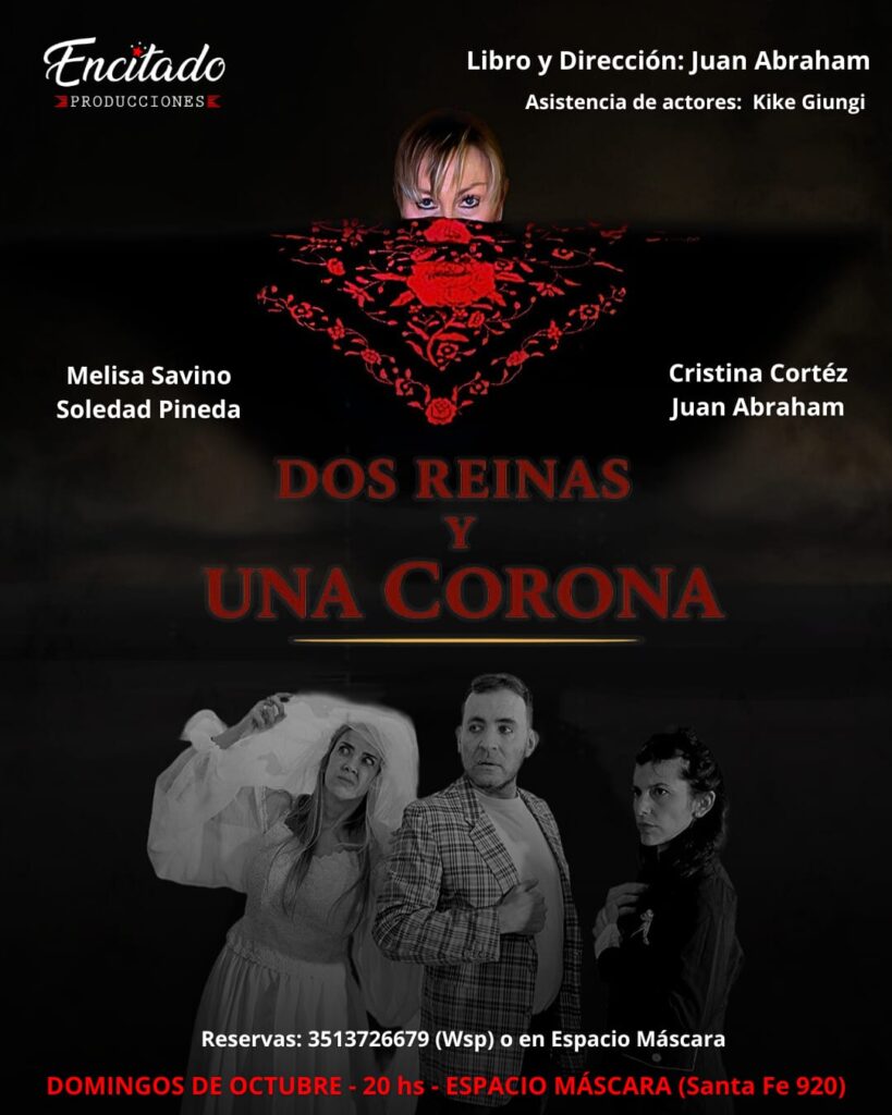 La compañía teatral Encitado Producciones estrenó su más reciente obra, “Dos Reinas y una Corona”, el pasado 5 de octubre a las 20 hs en Espacio Mascara (Santa Fé 920, Córdoba). Bajo la dirección y libro de Juan Abraham y con la asistencia actoral de Kike Giungi, la puesta se presenta todos los domingos de octubre a las 20:00 hs, consolidando una nueva apuesta del teatro independiente cordobés.