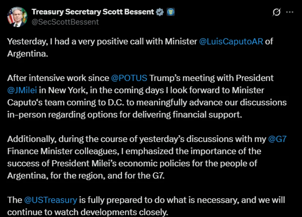 «El Tesoro de los Estados Unidos está totalmente preparado para hacer lo que sea necesario y continuaremos observando de cerca los acontecimientos», escribió Bessent en su cuenta de X. El funcionario destacó que estas conversaciones son resultado del intenso trabajo iniciado tras la reunión entre Donald Trump y Milei en Nueva York, y subrayó la importancia del éxito de las políticas económicas argentinas para la región y el Grupo de los 7.