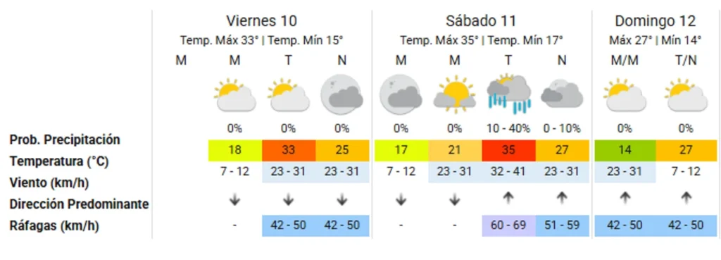 Para el cierre del fin de semana largo, el domingo promete mayor estabilidad. Aunque el viento sur seguirá presente con intensidad relevante, la máxima rondará los amenos 27 grados, ofreciendo una jornada más templada para las actividades al aire libre.