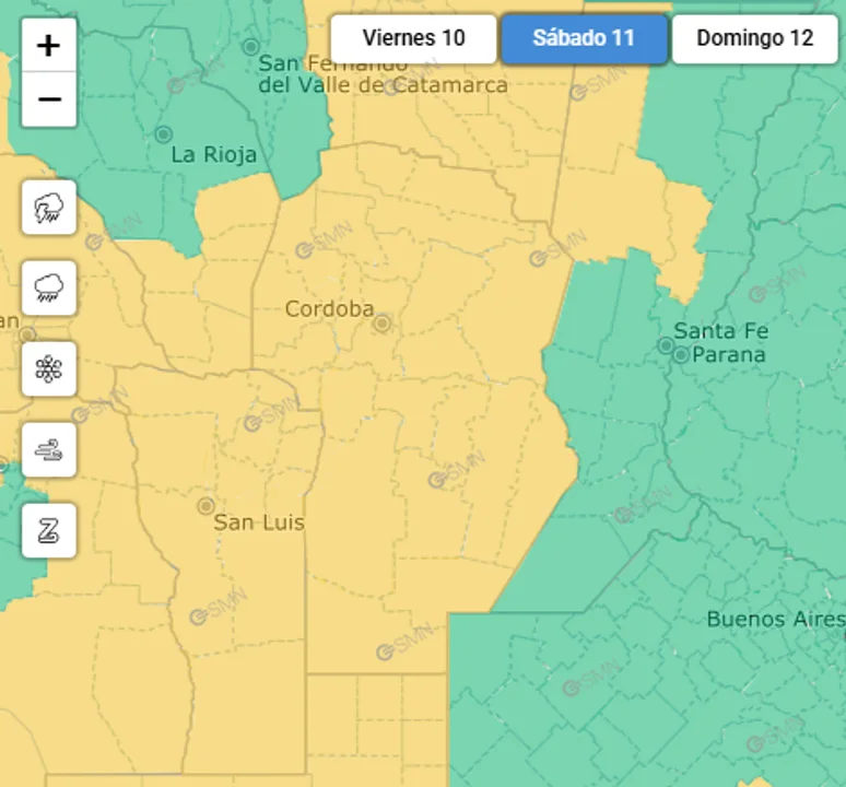 El Servicio Meteorológico Nacional emitió un alerta amarillo para toda la provincia de Córdoba a partir del mediodía del sábado. El Sistema de Detección Temprana advirtió que «el área será afectada por vientos del sector sur con velocidades entre 35 y 50 km/hora, y ráfagas que pueden alcanzar los 75 km/hora».