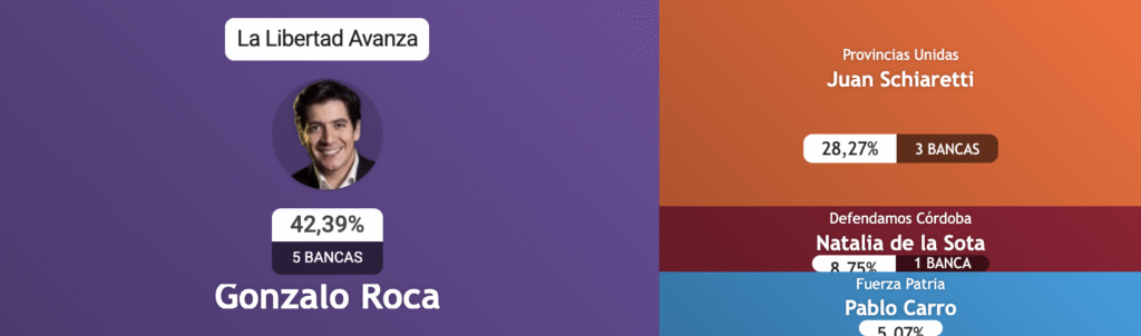 En Córdoba, la sorpresa fue mayúscula. Gonzalo Roca, un dirigente totalmente desconocido en la política cordobesa, logró imponerse con el 42,40% de los votos, obteniendo 5 bancas para La Libertad Avanza. El resultado consolida el modelo libertario en una provincia que históricamente había sido territorio de liderazgos provinciales fuertes. Juan Schiaretti, quien durante años dominó la escena política local, quedó relegado al segundo lugar con 3 bancas.